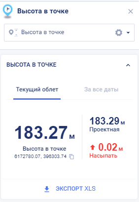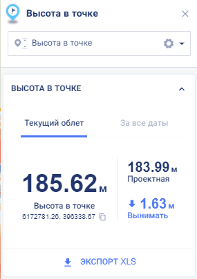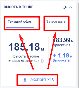 В виджете показаны следующие результаты измерения высоты в точке для текущего облета: