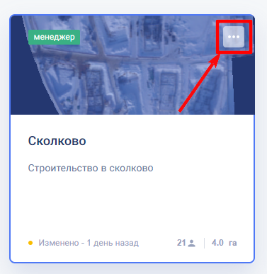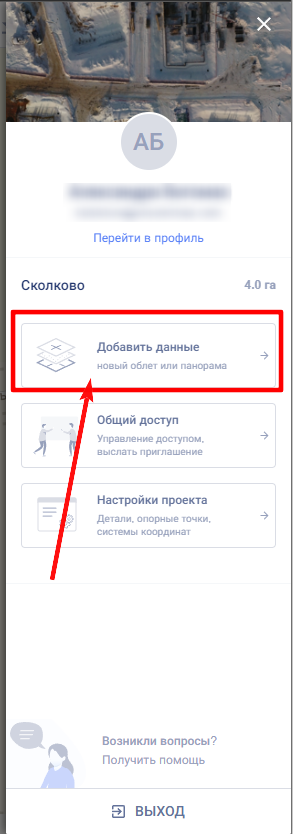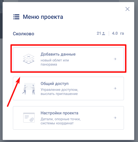 Добавление новых данных (ортофотоплан, ЦММ/ЦМР, облако точек) в проект осуществляется через меню проекта. Его можно открыть либо на странице проекта, либо через карточку объекта на стартовой странице платформы.