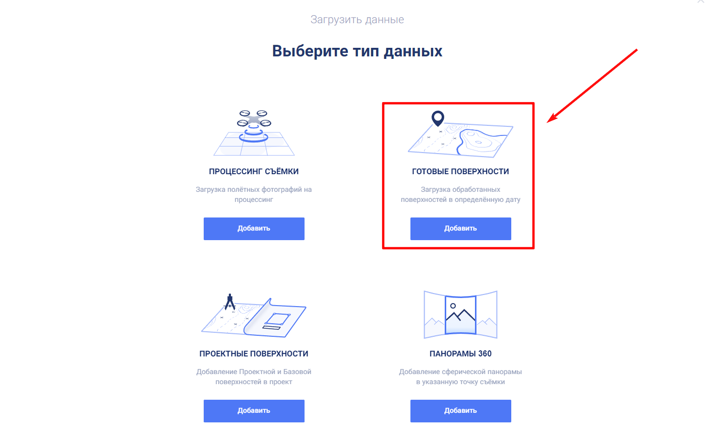 Появляется новое диалоговое окно с выбором типов данных для загрузки. Нажмите “Готовые поверхности”.