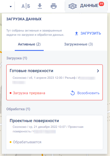 | Sub-item | Загрузка ортофотоплана, Загрузка рельефа, Загрузка облака точек, Загрузка панорам, Загрузка проектной поверхности, Загрузка базовой поверхности, Загрузка документации |