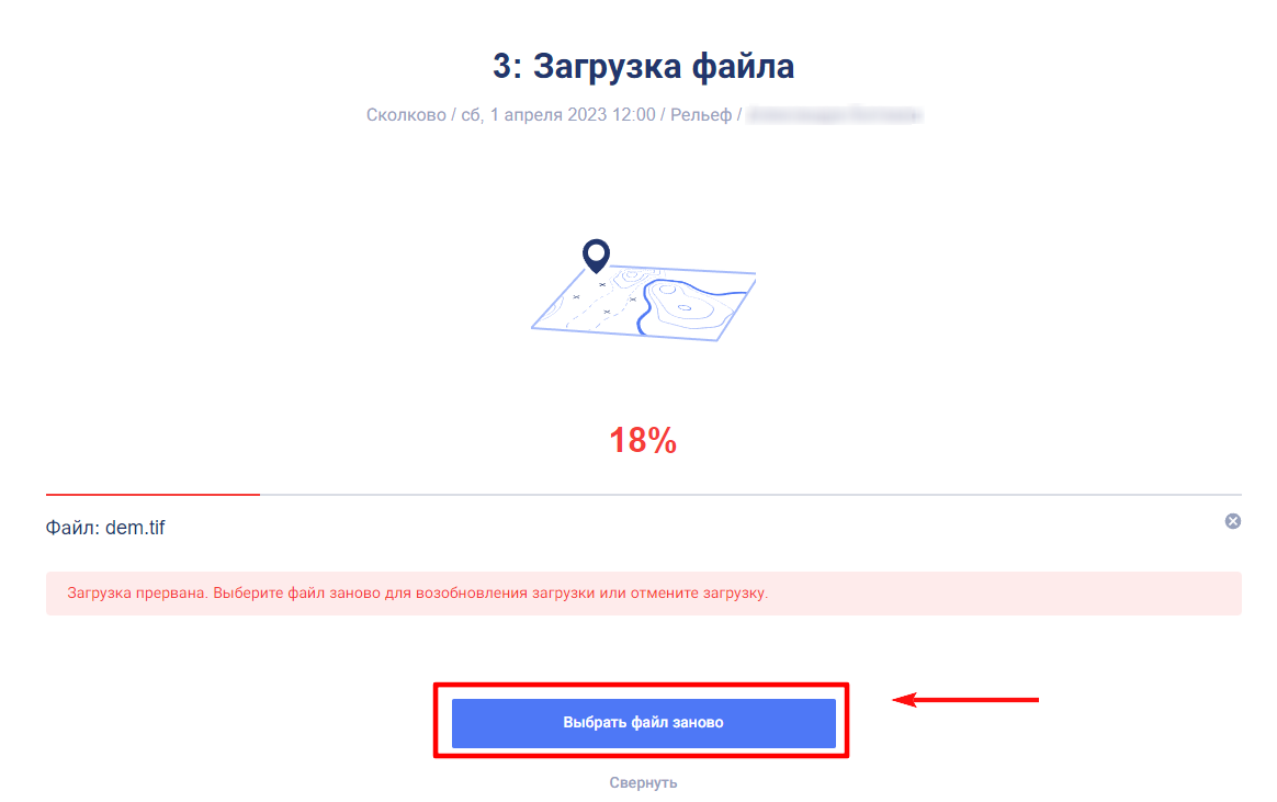 Для успешного завершения загрузки файла, необходимо выбрать тот же файл заново. Загрузка начнется с того момента, как она остановилась.