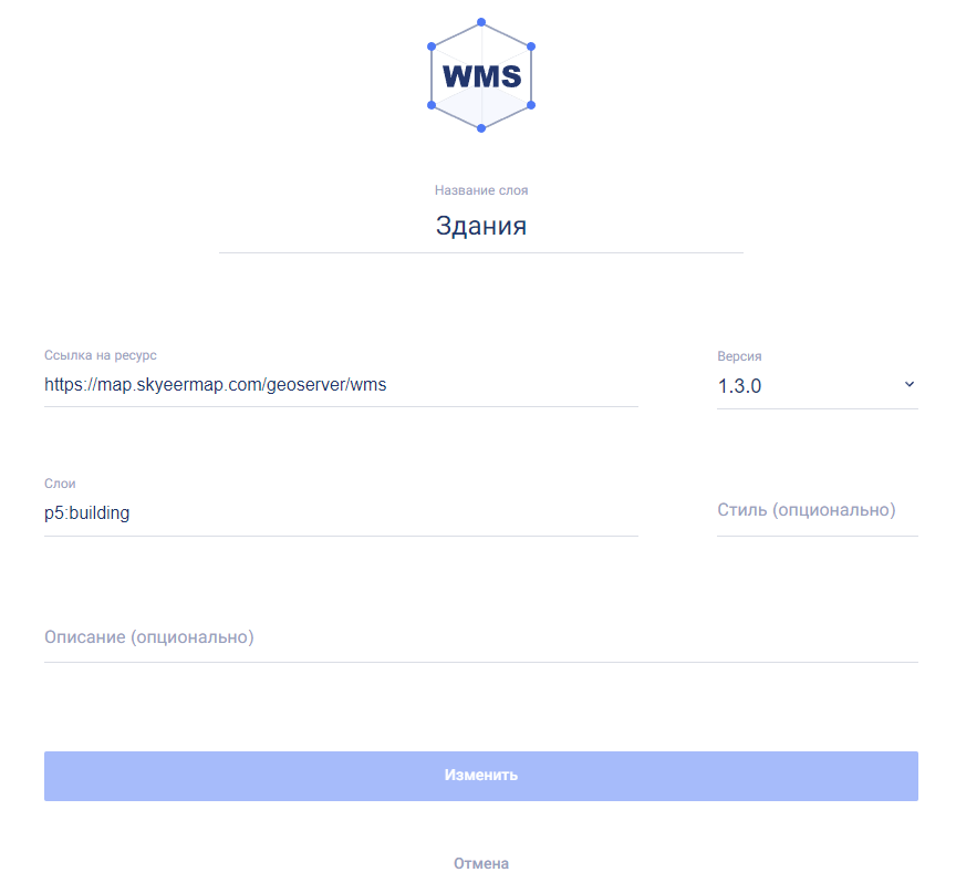 - ссылка на ресурс. Например, https://map.skyeermap.com/geoserver/wms. Обязательное поле для заполнения;