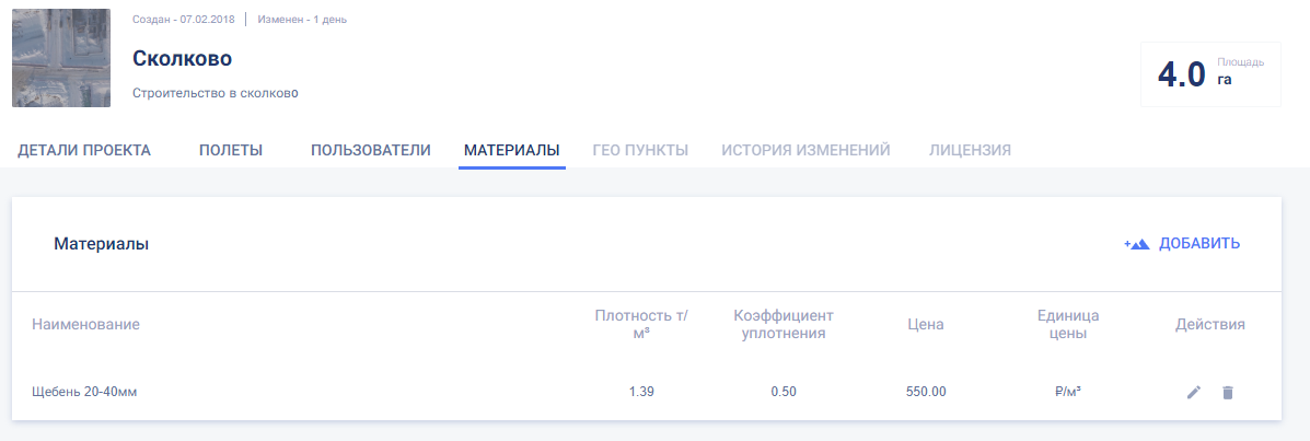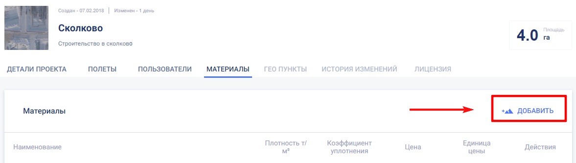 На вкладке “Материалы” находится список материалов, актуальных для данного проекта.