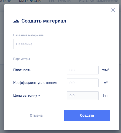 Нажмите кнопку “Создать” для добавления нового материала. Сохраненный материал появится в таблице.
