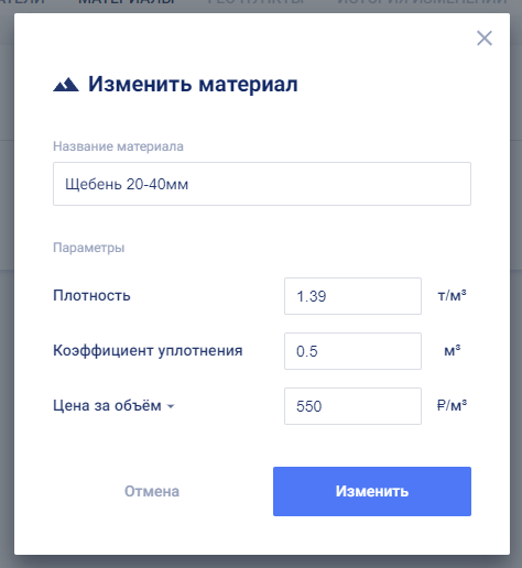По указанным параметрам рассчитается уплотненный объем материала (итоговый объем после транспортировки или уплотнения) и масса материала.