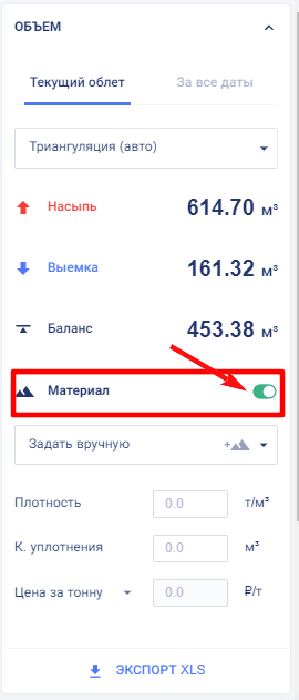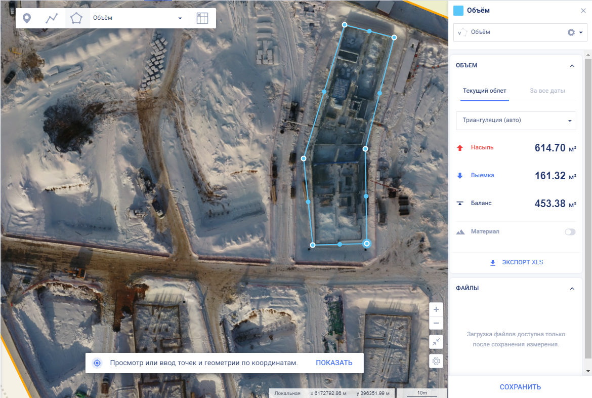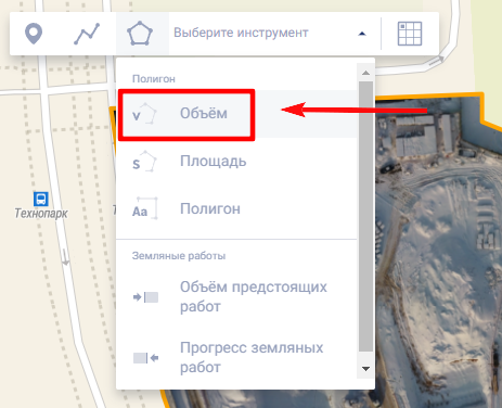 Для расчета объема используется цифровая модель местности/рельефа текущего облета. Если для текущего облета нет слоя ЦММ/ЦМР, инструмент недоступен и расчет невозможен.