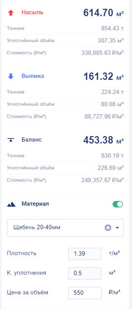 После ввода параметров материала будет произведен расчет дополнительных результатов измерения: тоннажа, уплотненного объема и стоимости.