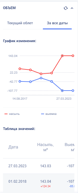 Для измерения объема, сохраненного во всех облетах, доступен просмотр статистики за все даты облетов. Статистика отображается в виде графика и таблицы значений в виджете “Объем”.