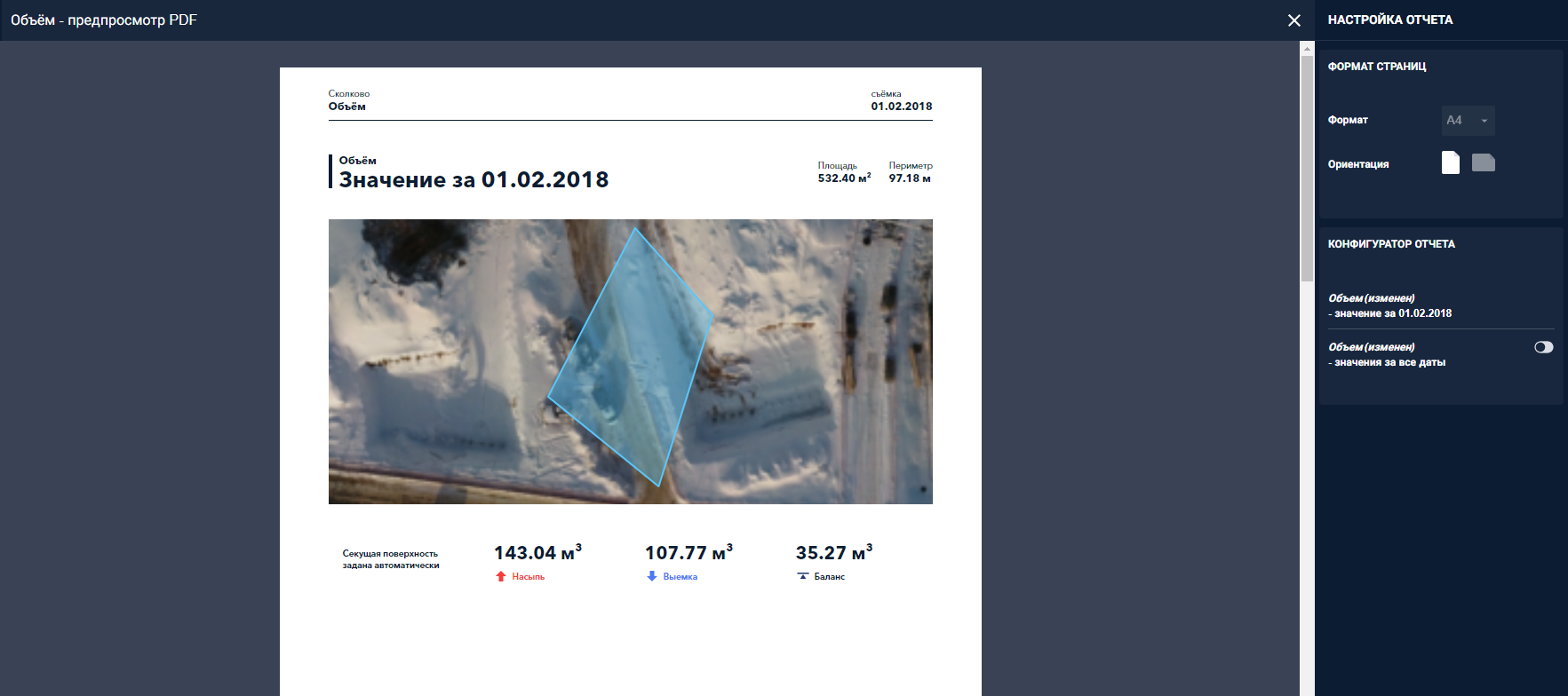 В таблице для каждой даты облета выводятся 3 измерения — насыпь, выемка, баланс. Если для какой-то из дат облета невозможно рассчитать объем, то в соответствующей ячейке таблицы ставится прочерк.