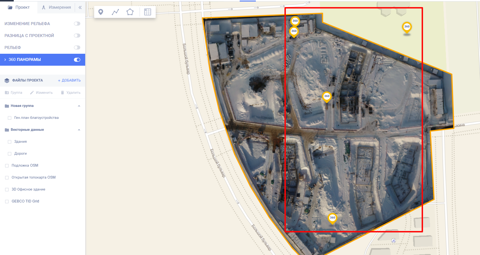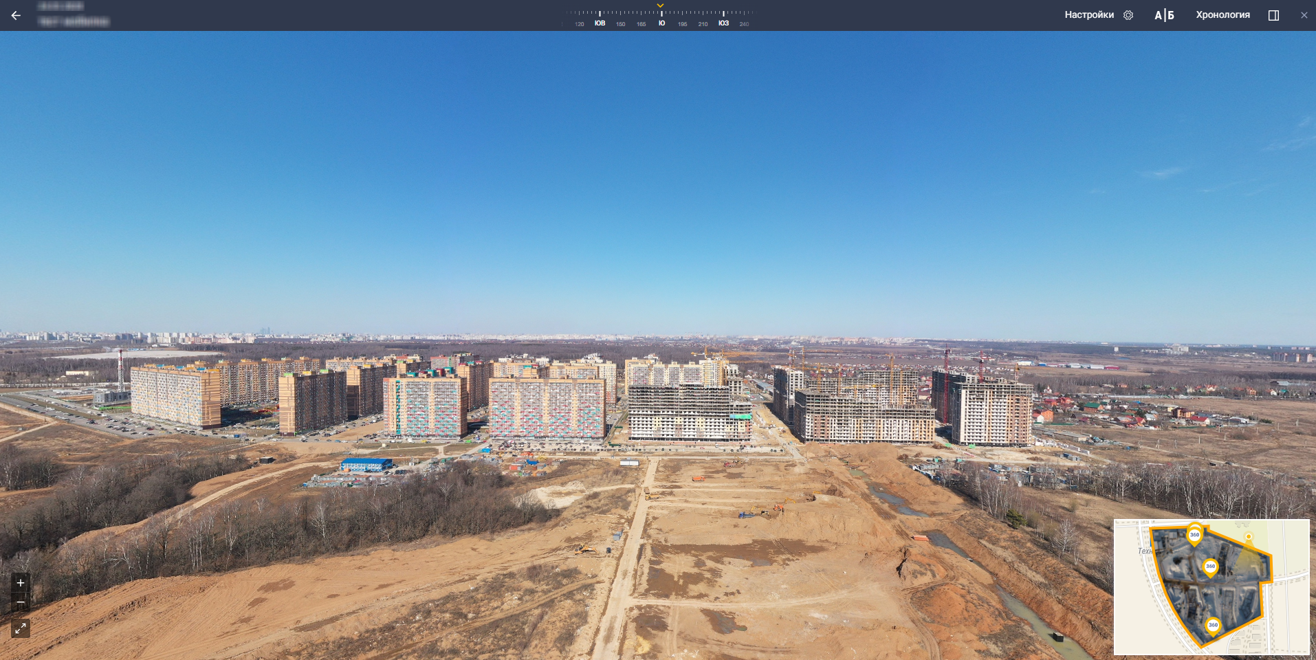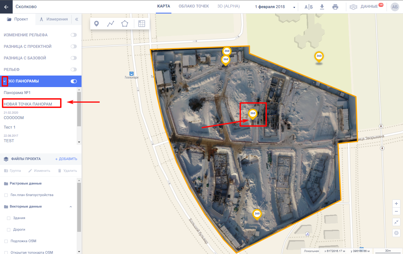 Воспользуйтесь функцией просмотра панорамных снимков, чтобы выполнить обзор площадки на 360 градусов. Для этого кликните на маркер точки панорамы на карте или в выпадающем списке панорам в левом сайдбаре.