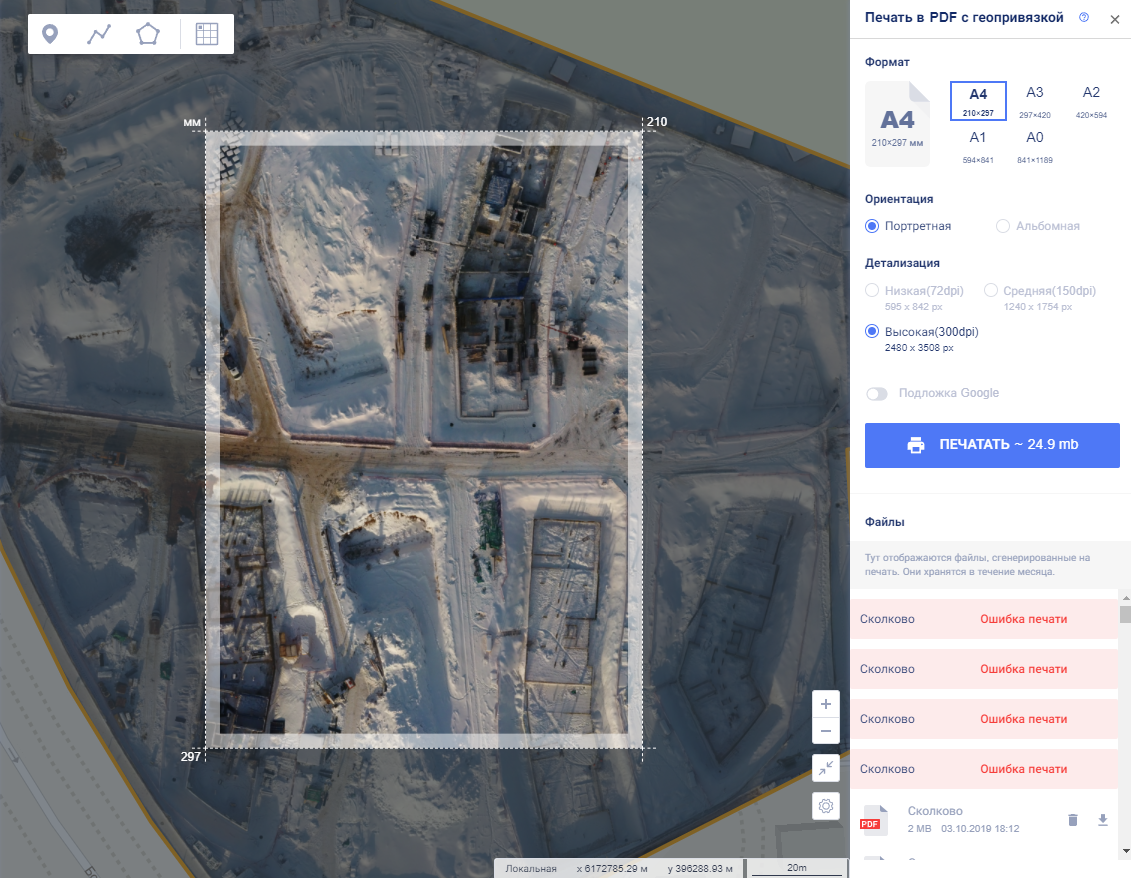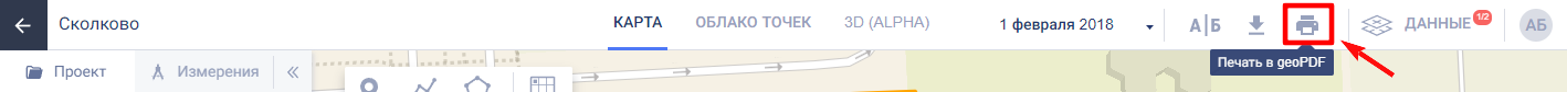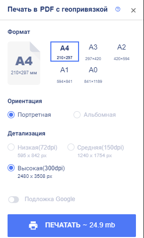 Нажмите кнопку «Печать» на панели инструментов, чтобы сохранить область карты в формате geoPDF для последующей печати.