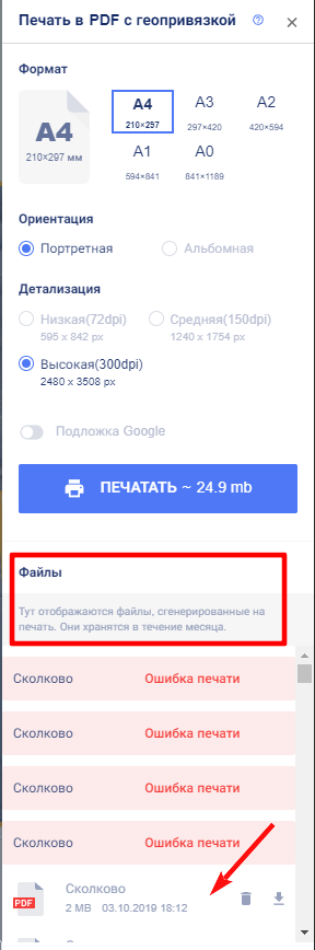 Под кнопкой “Печать” находится список файлов, сгенерированных за последний месяц.
