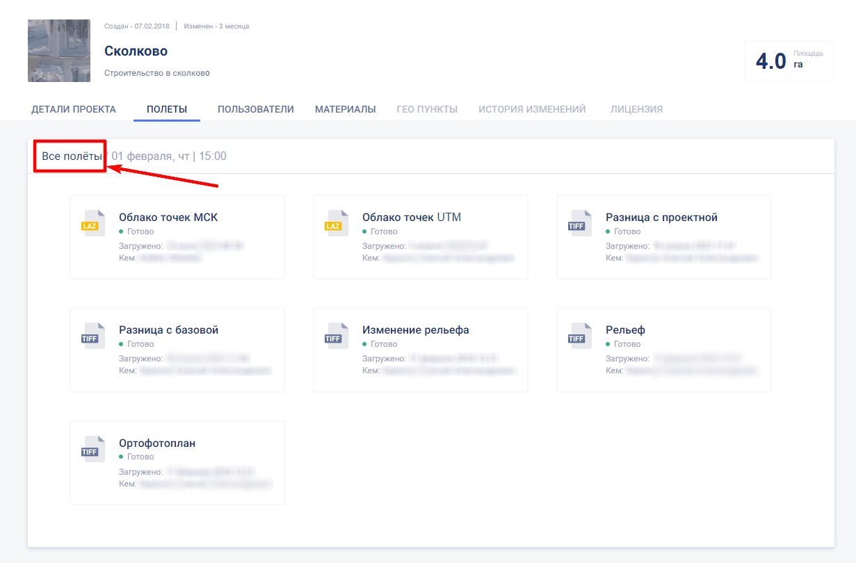 В настройках проекта, на вкладке “Полеты” показаны все добавленные в проект облеты.