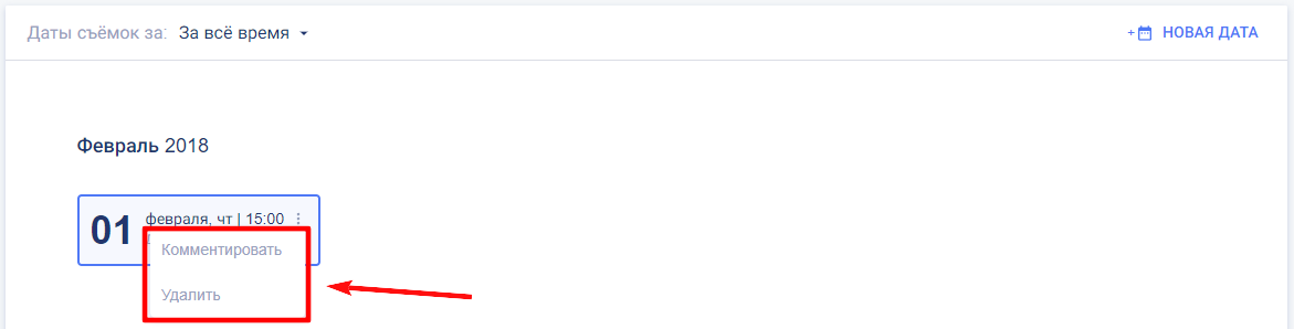 В каждой дате облета есть контекстное меню, которое открывается иконкой 3 точки.