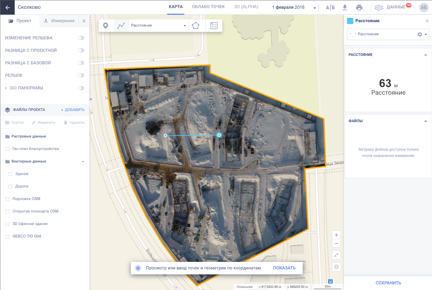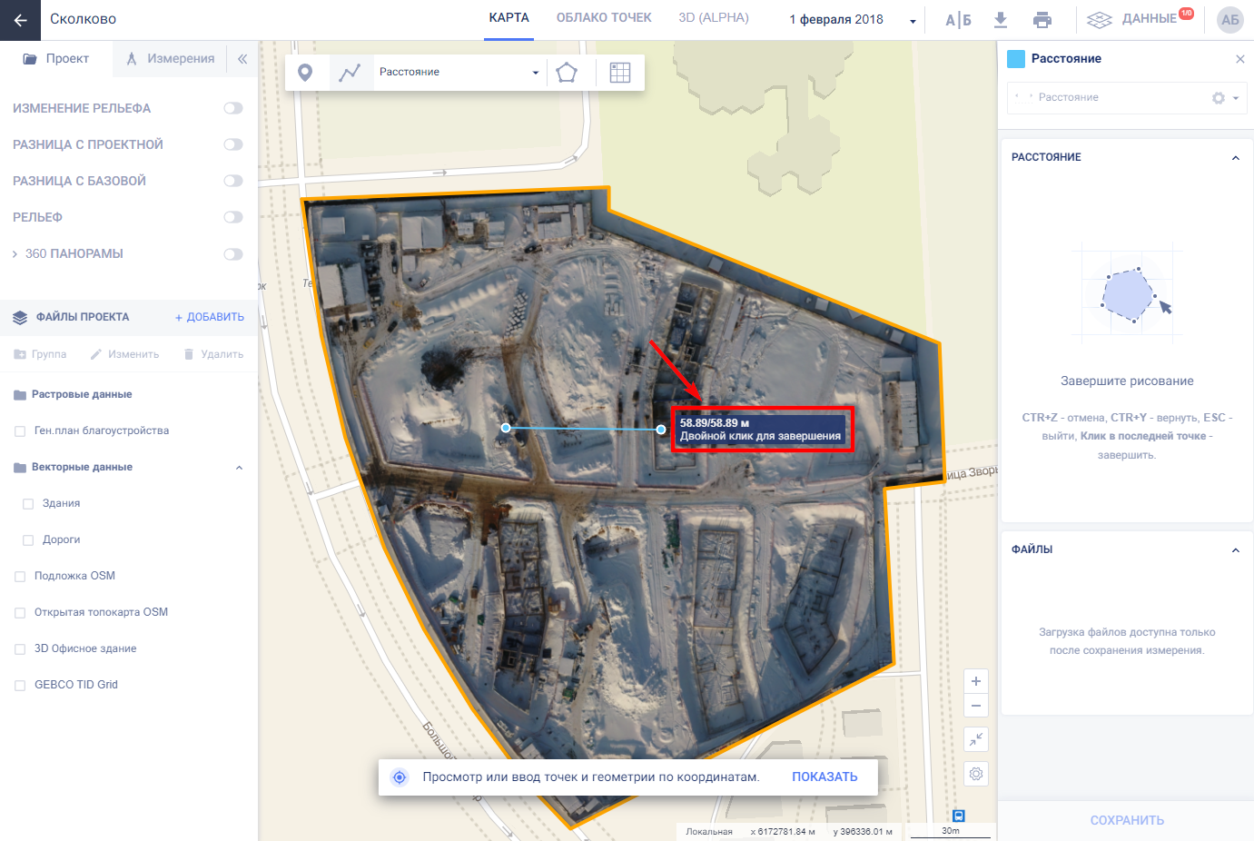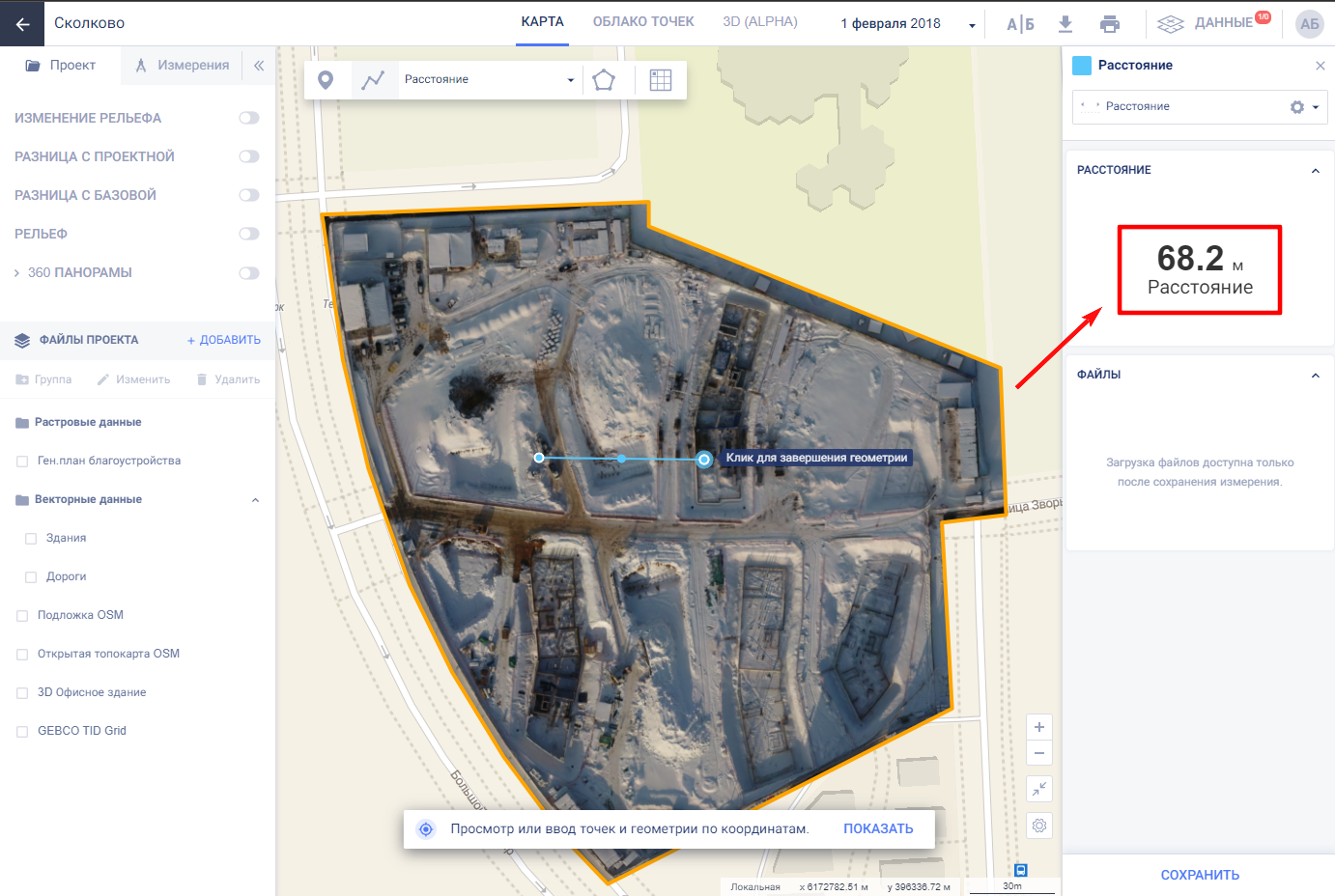 При завершении построения линии, в правом сайдбаре выводится значение расстояния с учетом рельефа.