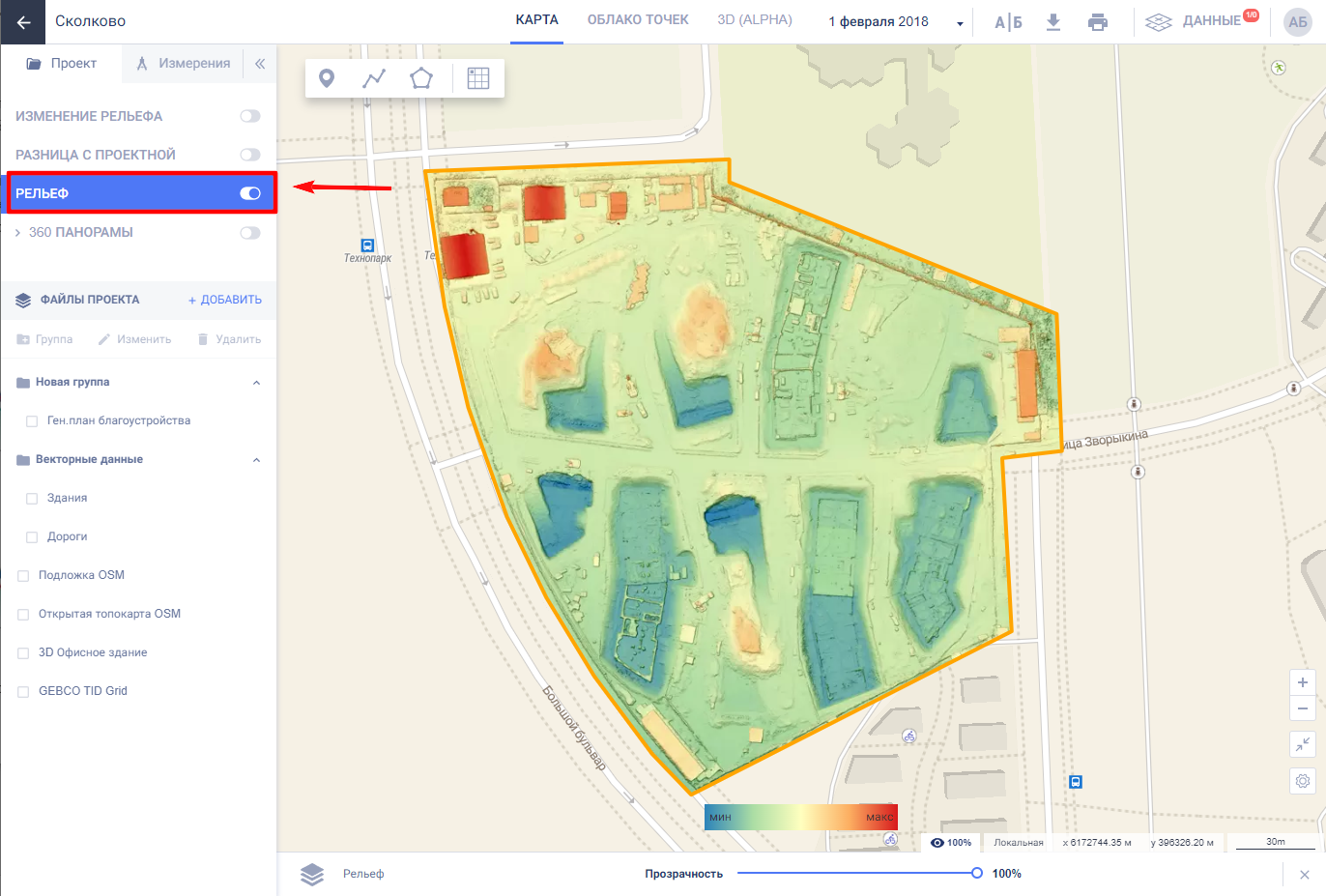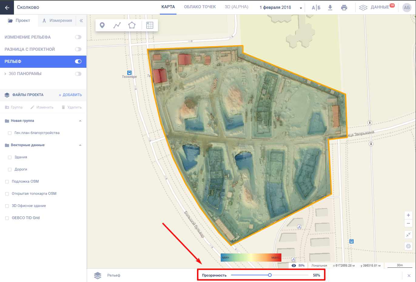 В платформе для отображения слоя “Рельеф” реализован инструмент “Прозрачность”, где можно отрегулировать прозрачность наложения слоя на ортофотоплан.