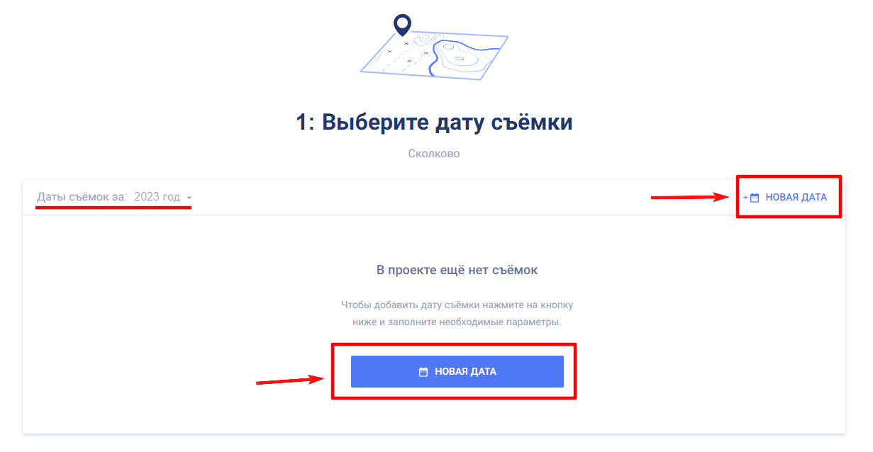 Открывается экран с датами съёмок. По умолчанию сортировка облетов происходит за текущий год. Для добавления нового облета необходимо нажать кнопку “Новая дата”.