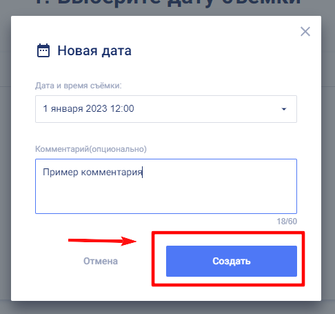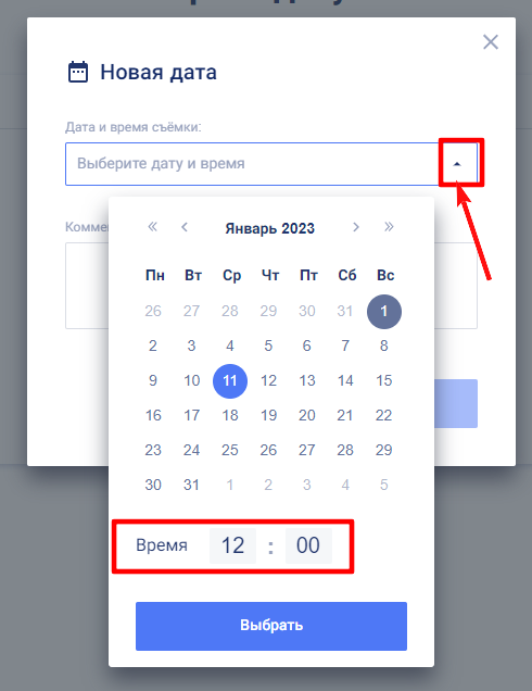 Появляется новое диалоговое окно, где необходимо указать дату и время облета. При необходимости можно добавить комментарий к облету, который будет выводится в хронологической таблице проекта. Нажмите кнопку “Выбрать” для подтверждения выбора даты и времени облета и кнопку “Создать” для подтверждения создания облета.