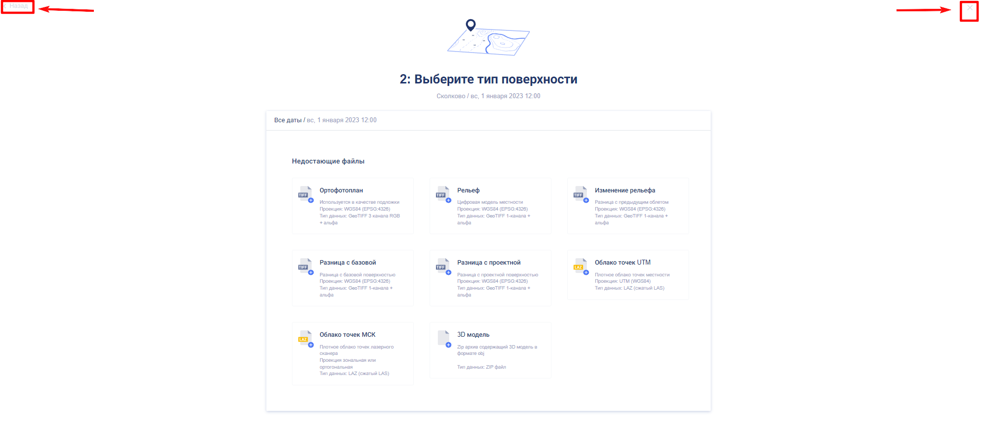 Открывается экран с выбором добавления поверхностей в созданную дату облета. В левом и правом верхних углах странице есть кнопки “Крест” и “Назад”, чтобы вернуться на страницу проекта.
