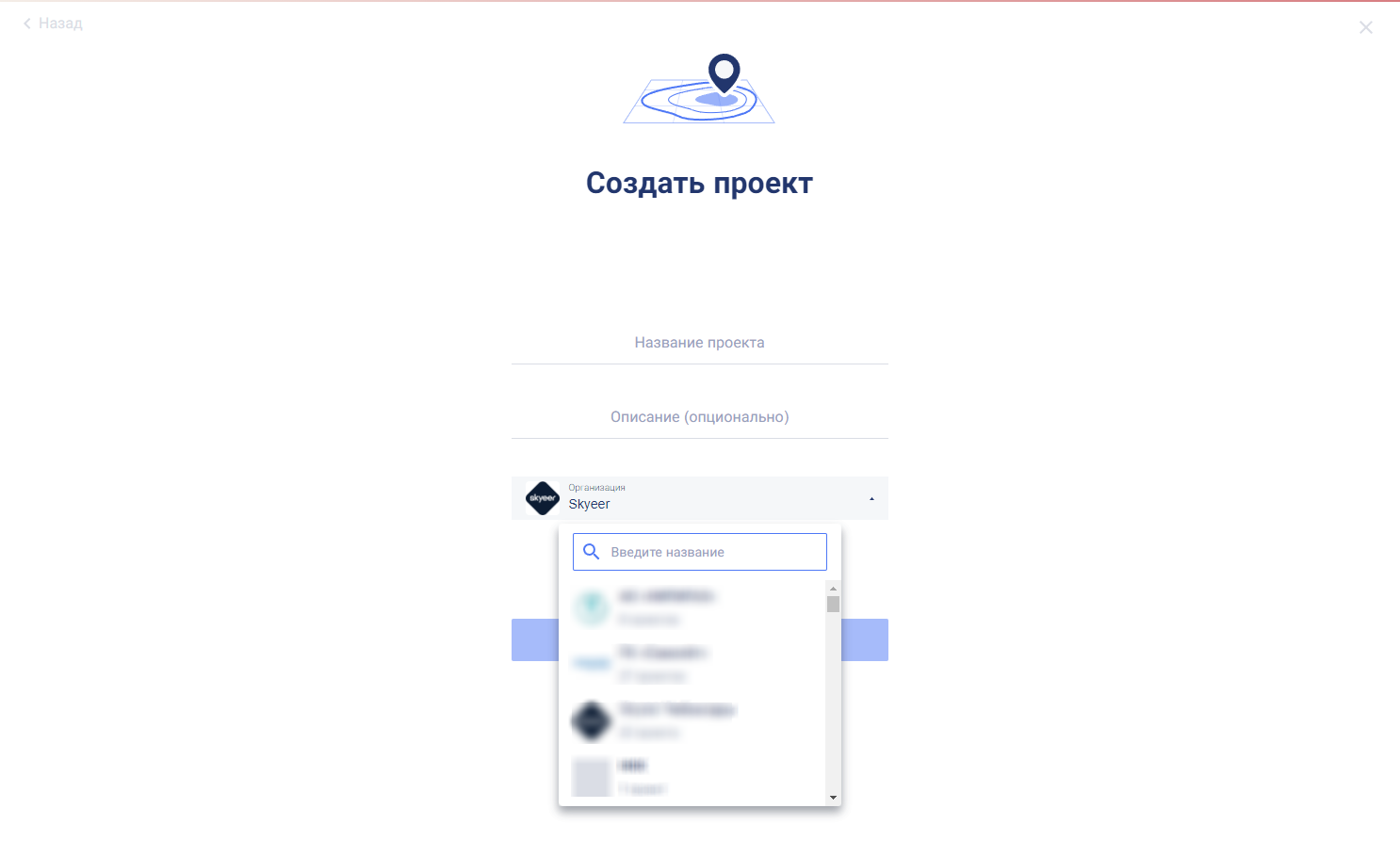 Открывается форма создания нового проекта. В этой форме требуется ввести название проекта и выбрать из выпадающего списка ту организацию, где будет создан новый проект.