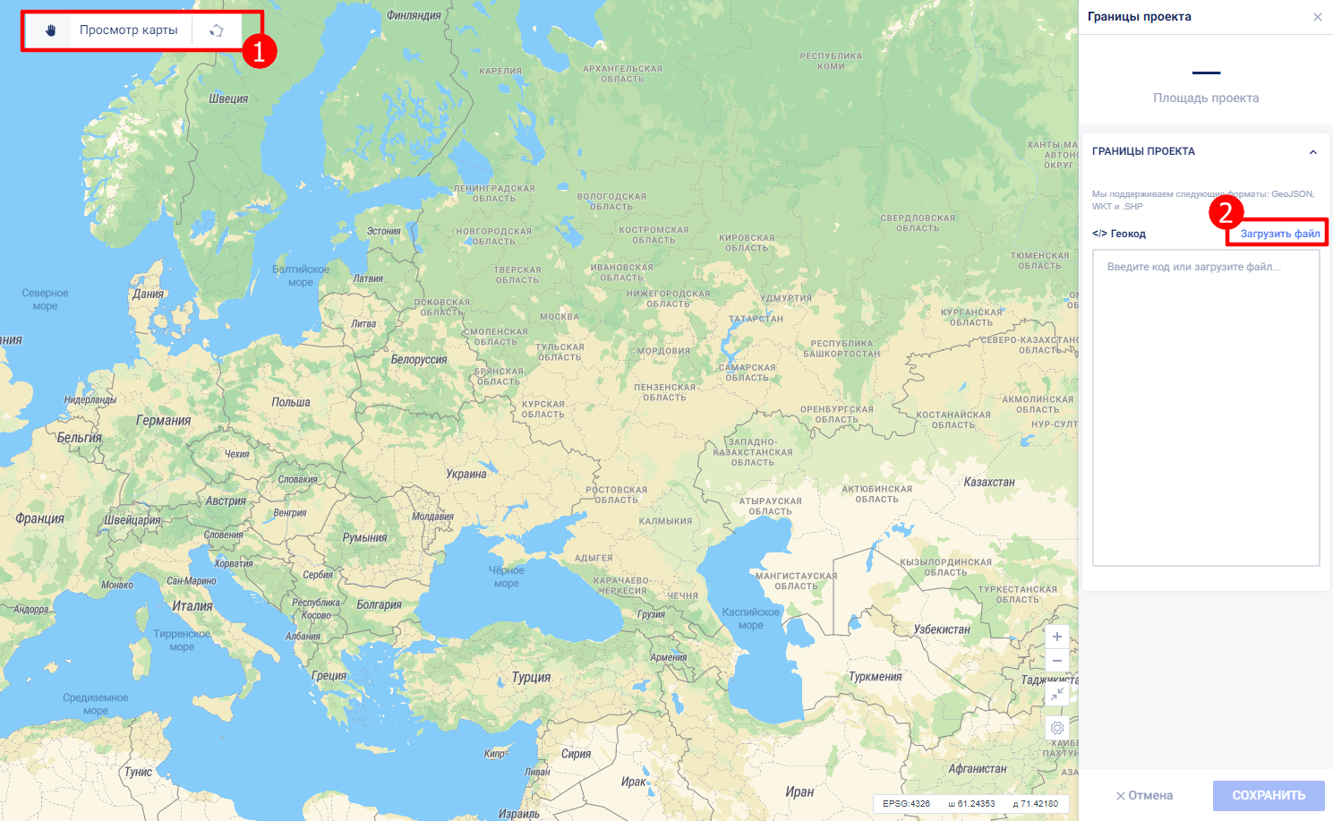 В платформе поддерживается загрузка геометрии из .shp, WKT, GeoJSON. Геометрия должна быть в системе координат WGS-84 (EPSG:4326).