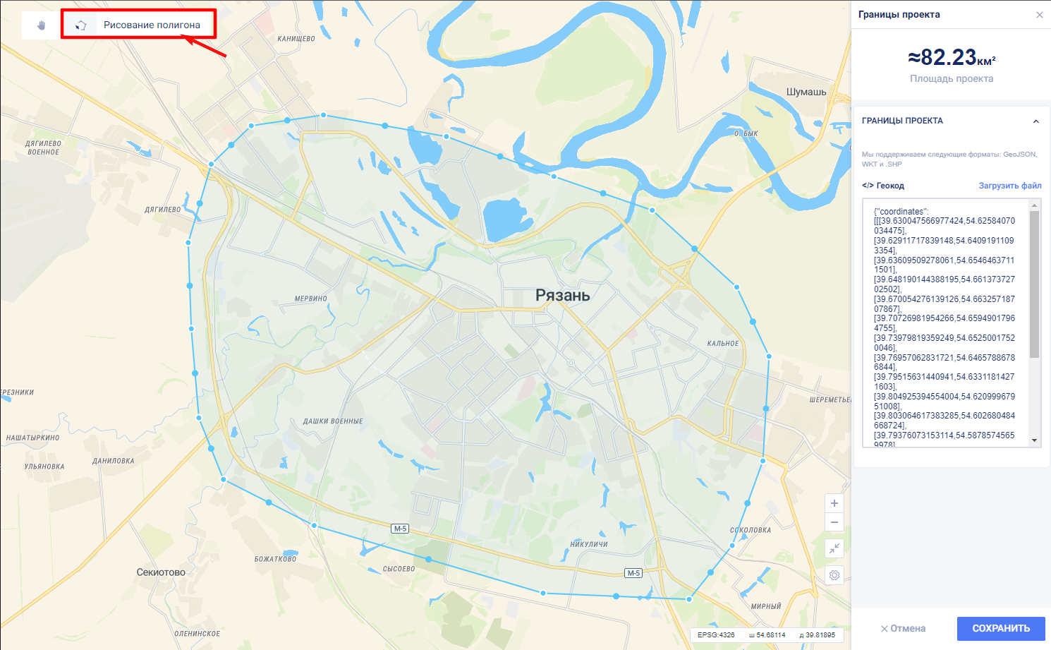 После завершения рисования полигона в окне “Геокод” становится активной кнопка “Сохранить” и отображаются координаты вершин полигона в WGS-84 (EPSG:4326).