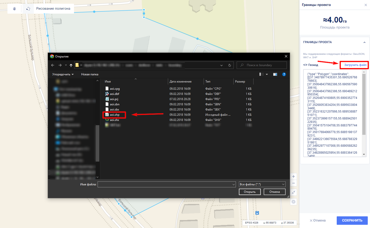 Для добавления геометрии необходимо нажать на кнопку “Загрузить файл”, появится новое диалоговое окно, где необходимо выбрать нужную директорию (папку) с файлом границ.
