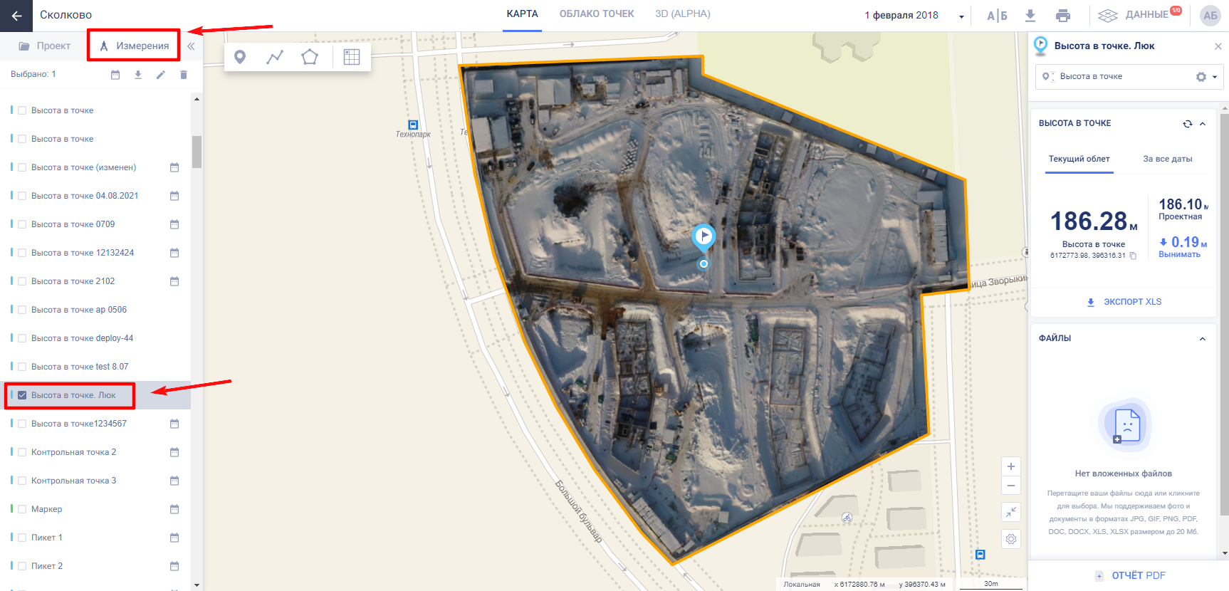 Результат измерения появится во вкладке “Измерения” в левом сайдбаре, в группе “Высота в точке”.