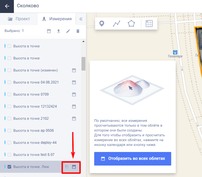Наведите курсор на название сохраненного измерения в списке измерений. Справа от названия измерения появится иконка календаря. Наведите курсор на данную иконку и в новом диалоговом окне нажмите кнопку “Отобразить во всех облетах”.