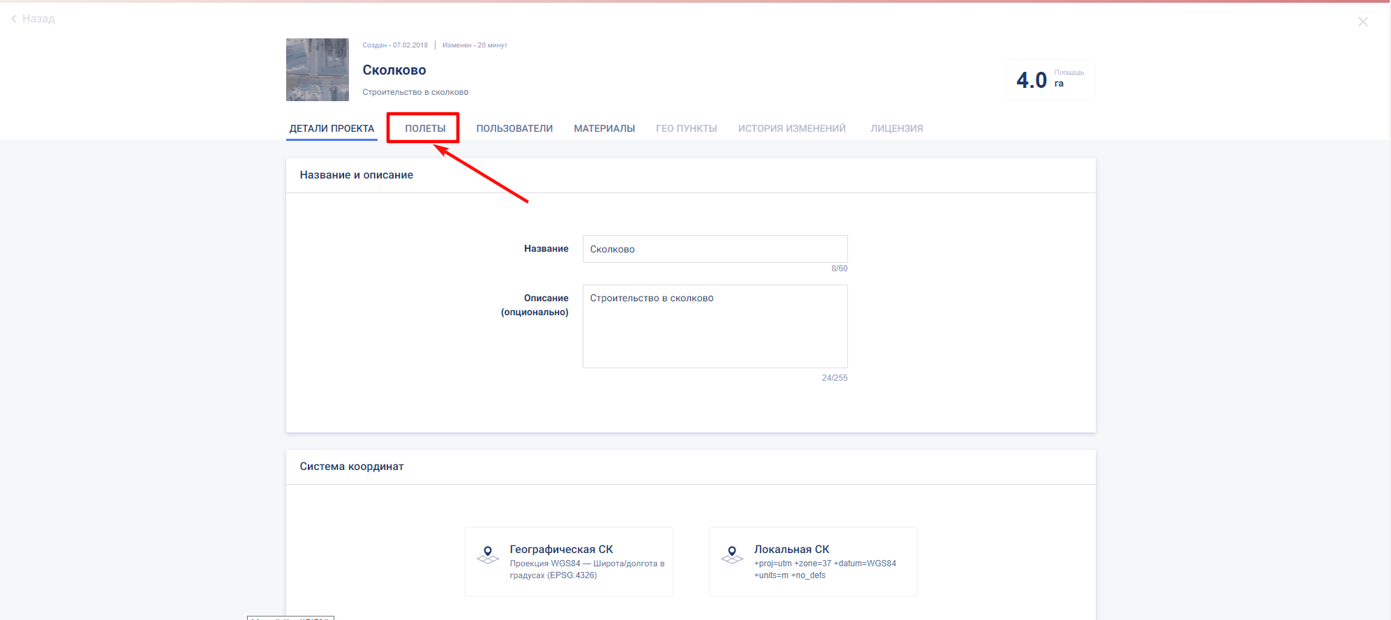 По умолчанию страница “Настройки проекта” открывается на вкладке “Детали проекта”. Для удаления даты облета необходимо открыть вкладку “Полеты”.