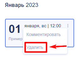 Выбираем иконку даты, которая будет удалена. Наводим курсором на карточку даты, нажимаем на появившуюся кнопку с 3-мя вертикальными точками.