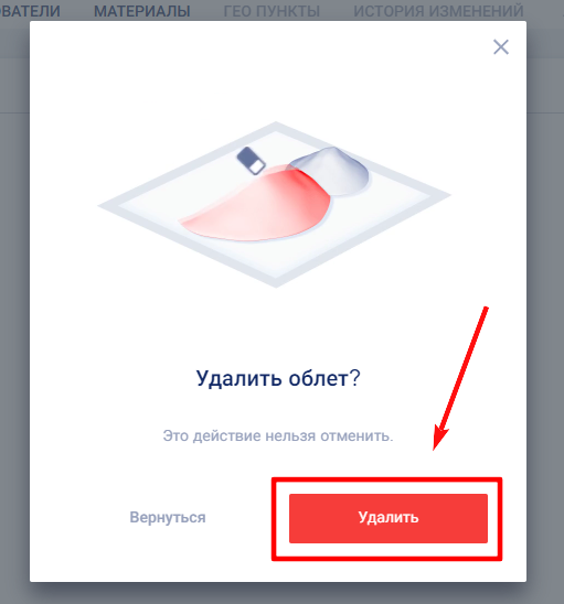 Появляется новое диалоговое окно с подтверждением удаления облета. Нажмите кнопку “Удалить”, чтобы подтвердить действие, либо кнопку “Вернуться” для возвращения на экран с вкладкой “Полеты” в настройках проекта.