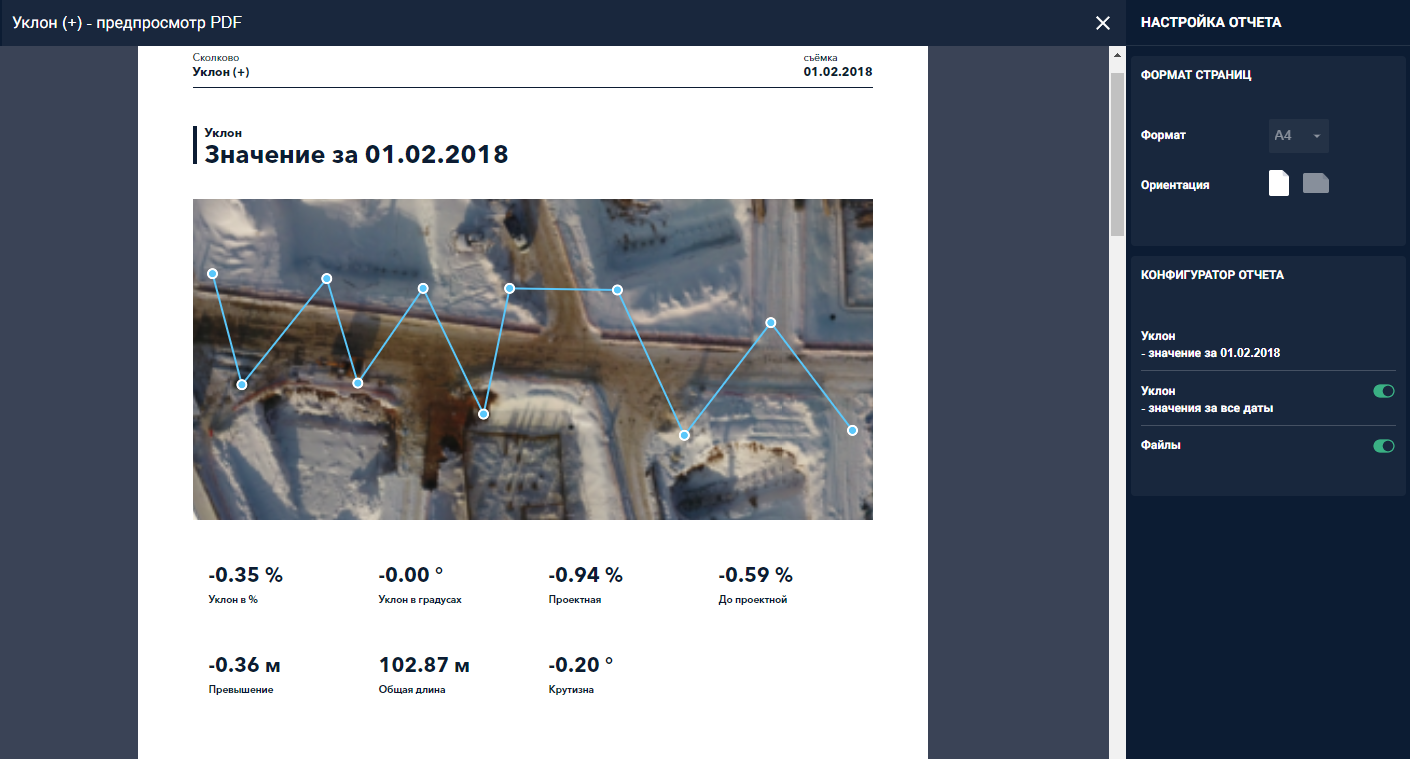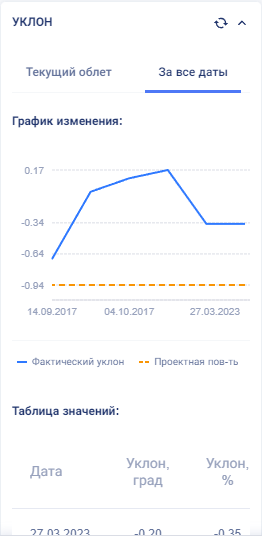 Для измерения уклона, сохраненного для всех облетов, доступна кнопка просмотра статистики “За все даты”. Данные статистики представлены на графике и в таблице. На графике синей линией показано текущее значение уклона, а желтой пунктирной — проектное значение.