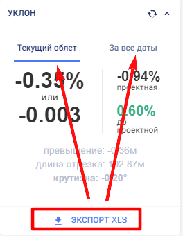 Сохраненные результаты измерения возможно выгрузить в формате XLS за текущий облет, либо для всех дат облетов. Для этого нажмите кнопку “Экспорт XLS” в виджете “Уклон”.