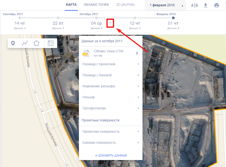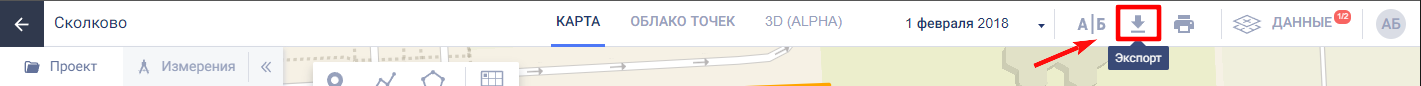 Все результаты облетов, загруженные ранее в платформу, возможно скачать себе на компьютер. Для этого нажмите кнопку “Экспорт” на панели управления проектом.